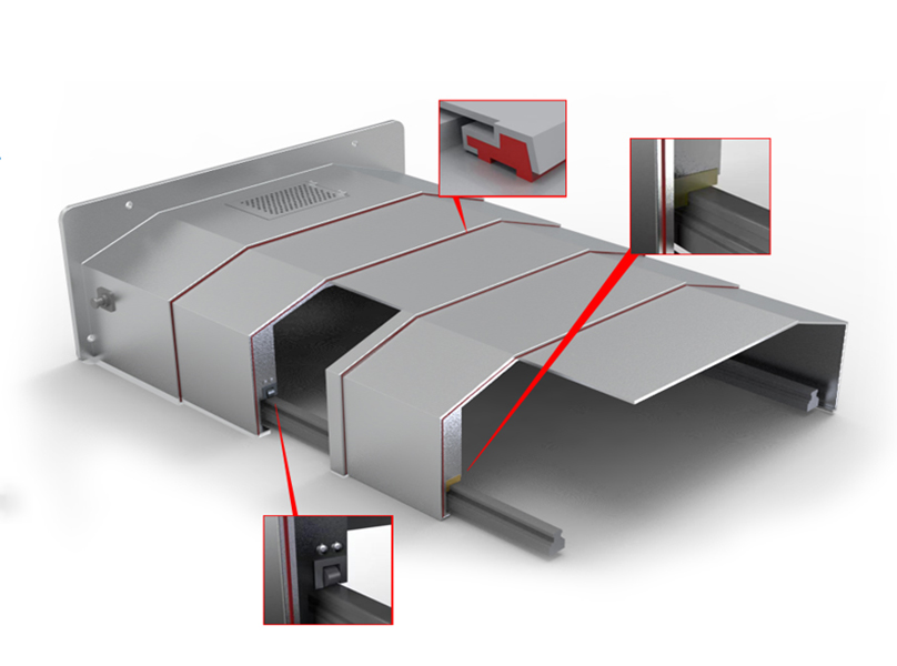 Through special design and with the appropriate scraping board system, it can effectively prevent the entry of metal chips, coolant, and accidental accidents of tools. The guide steel plate shield is durable, stable and high-speed operation, and has a longer service life. Production can be customized according to customer needs.